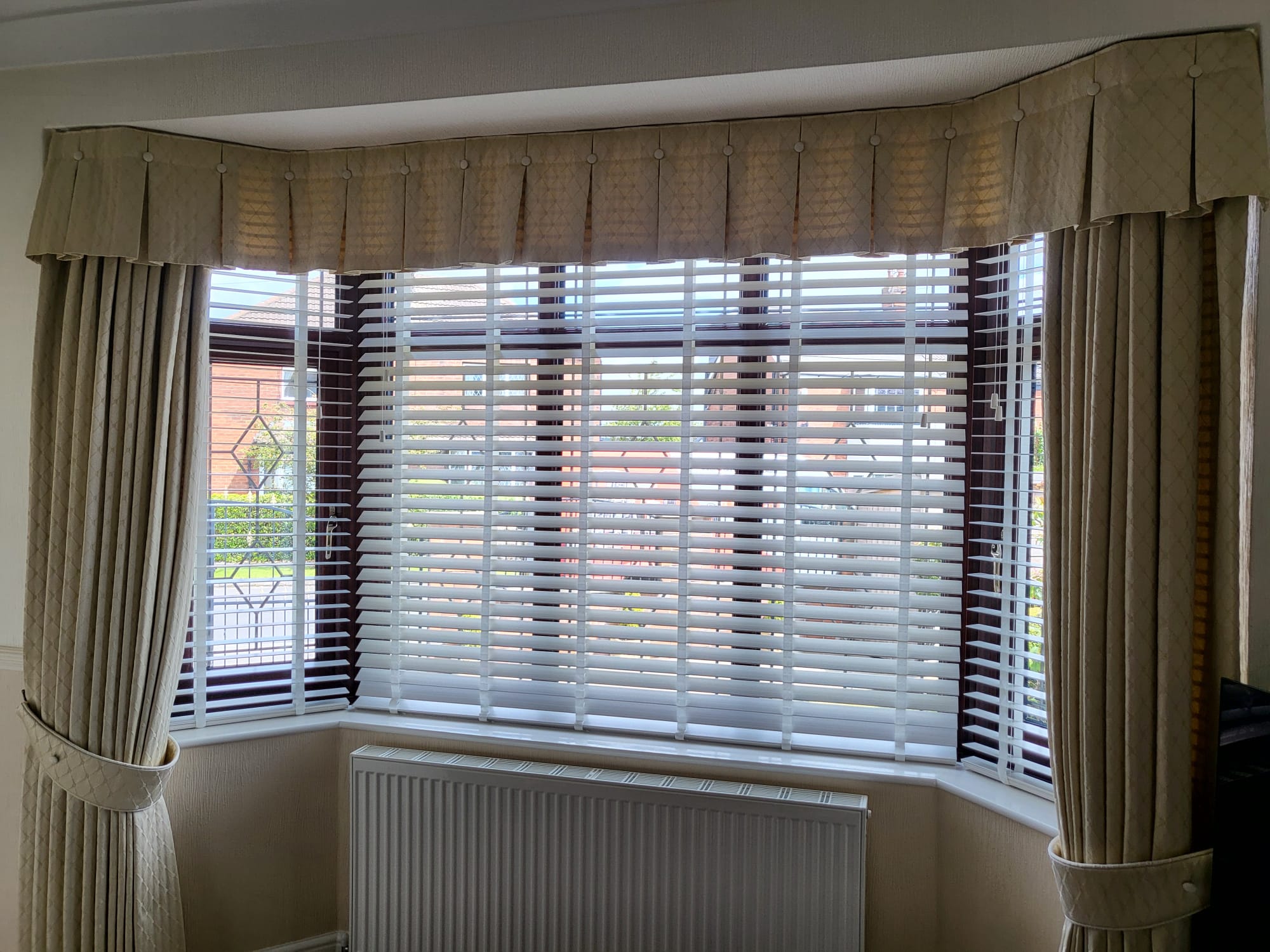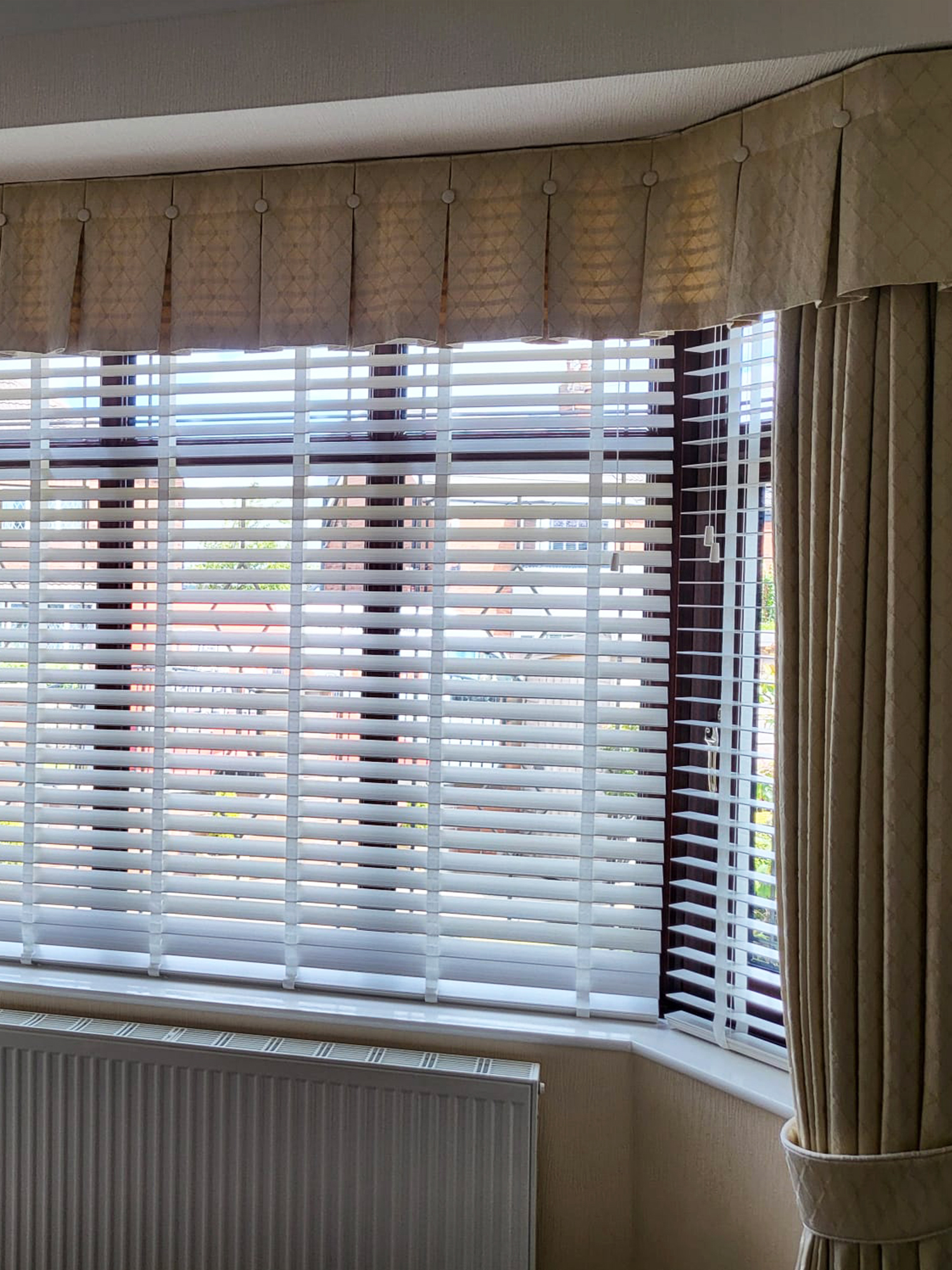 We have installed two bay windows in Cirrus with White Tapes and the kitchen blind is Medium Oak with Taupe tapes.